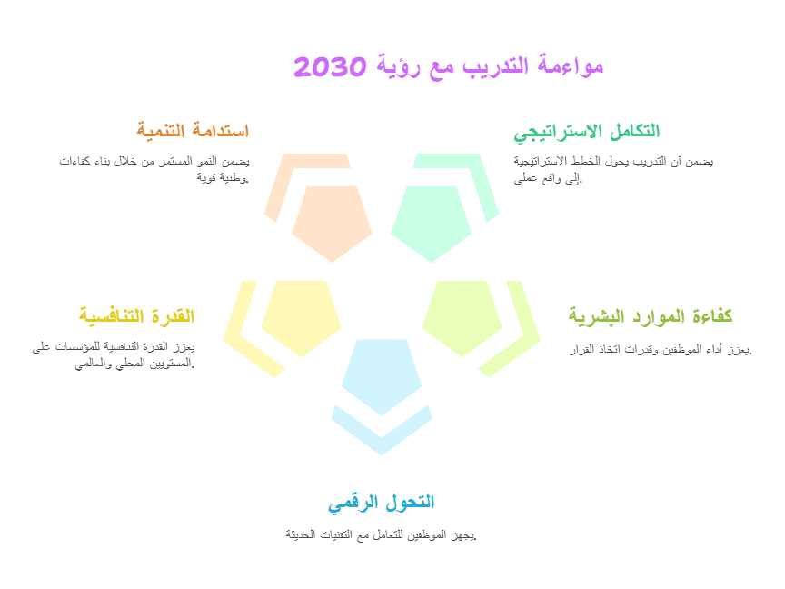 رؤية 2030 تضع التحول الرقمي والابتكار في مقدمة أولوياتها. من خلال مواءمة التدريب المؤسسي مع هذه الأولويات، تُجهز المؤسسات كوادرها للتعامل مع التقنيات الحديثة وتبني الحلول الابتكارية.